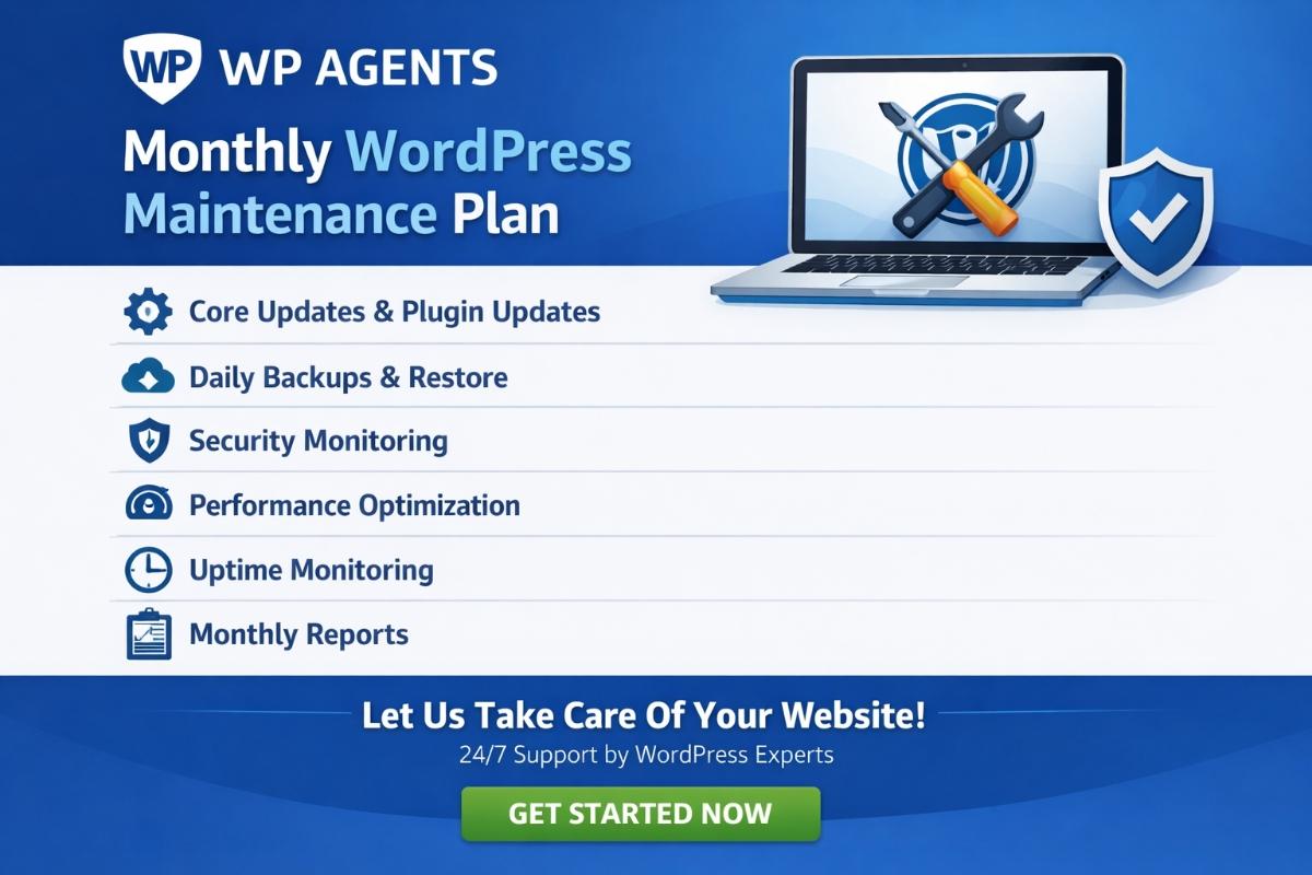 A WordPress Maintenance Plan usually includes backups, WordPress core updates, theme and plugin updates, security monitoring, uptime monitoring, speed optimization, bug fixes, and regular website health checks.